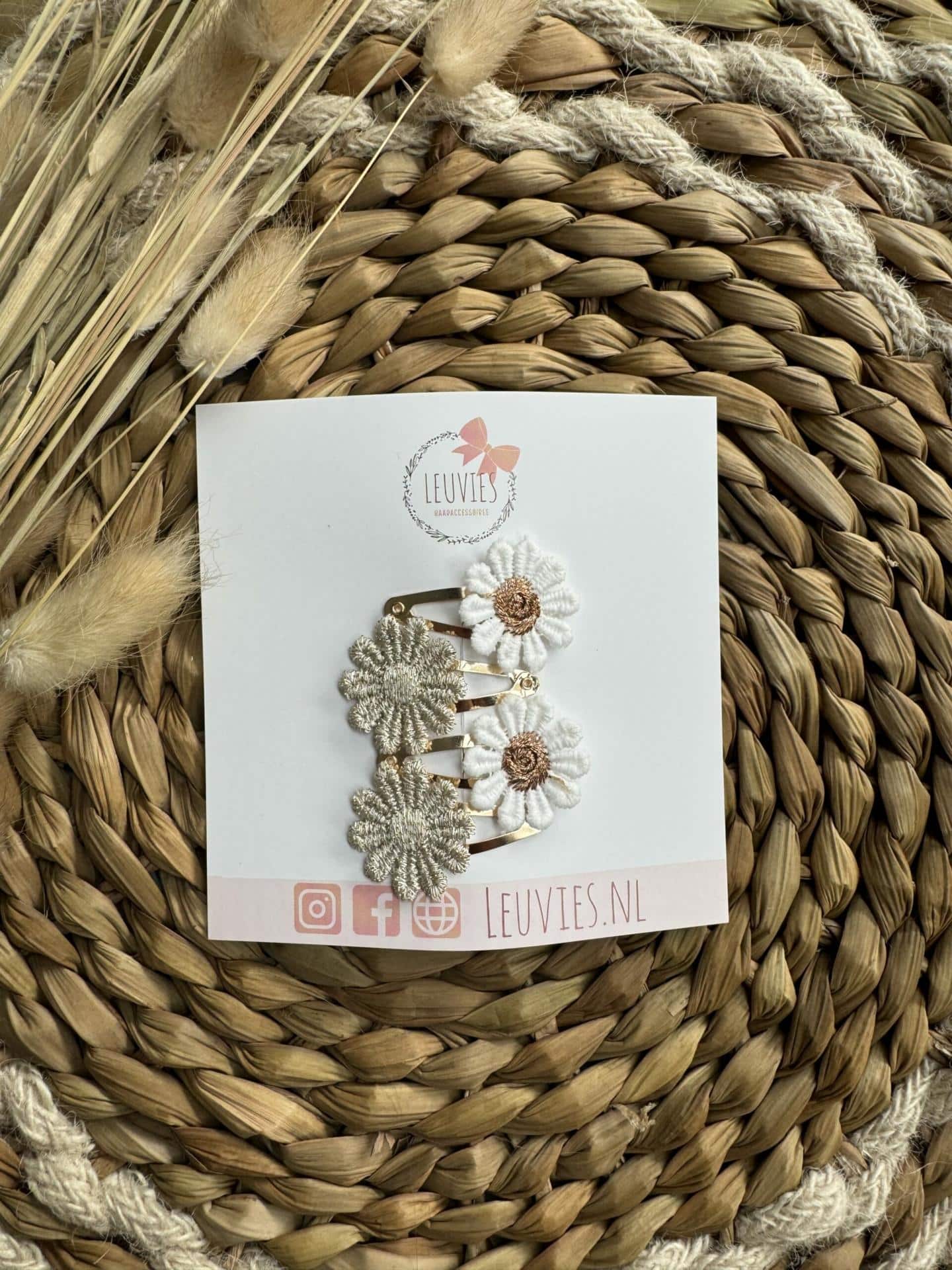 Home > Babykleding > Haaraccessoires > Leuvies setje van 4 klikklak haarspeldjes – Daisy gold en cream brown