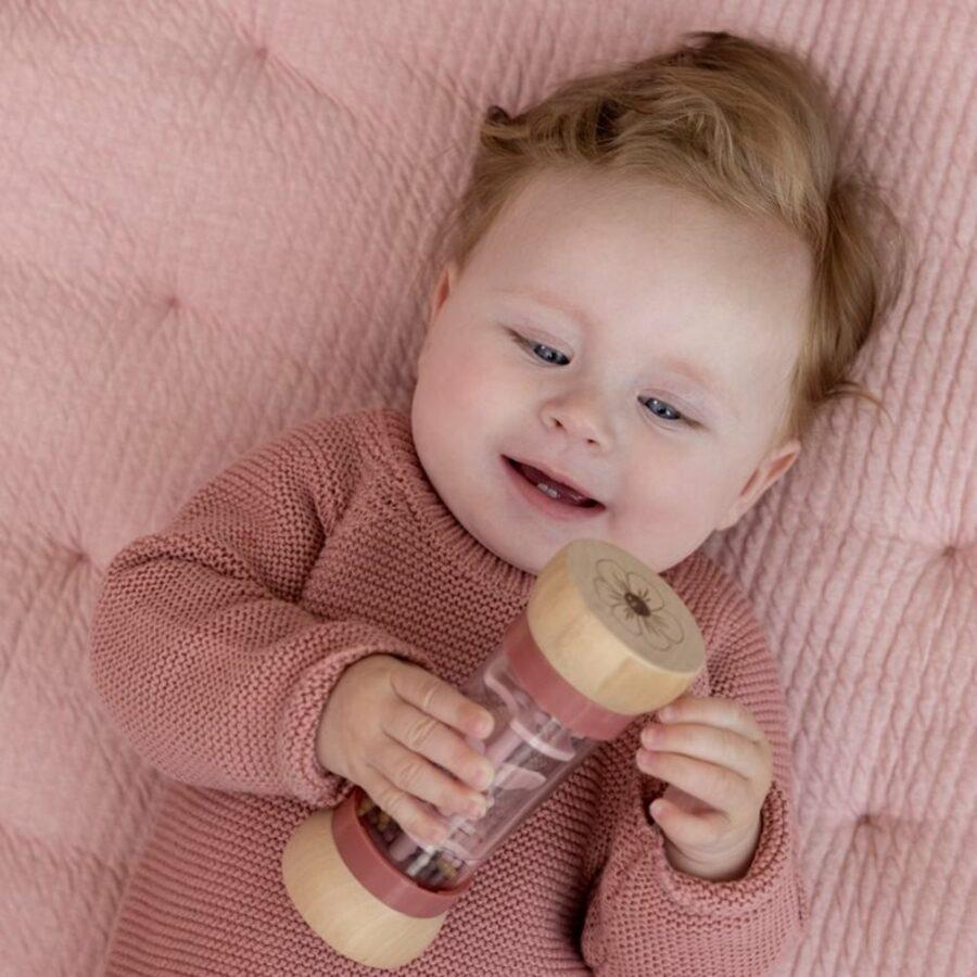 Schud en rammel! Draai de regenrammelaar om en luister naar de rustgevende druppelgeluidjes van de balletjes die van de ene naar de andere kant van de regenmaker bewegen. Het stimuleert de zintuiglijke ontwikkeling en het muzikale talent van de baby. De balletjes, vallen door kleine openingen in de buis en laten de propeller draaien, wat resulteert in een aangenaam geluid. De regenrammelaar is ontworpen voor kleine handjes en ligt lekker in de hand.